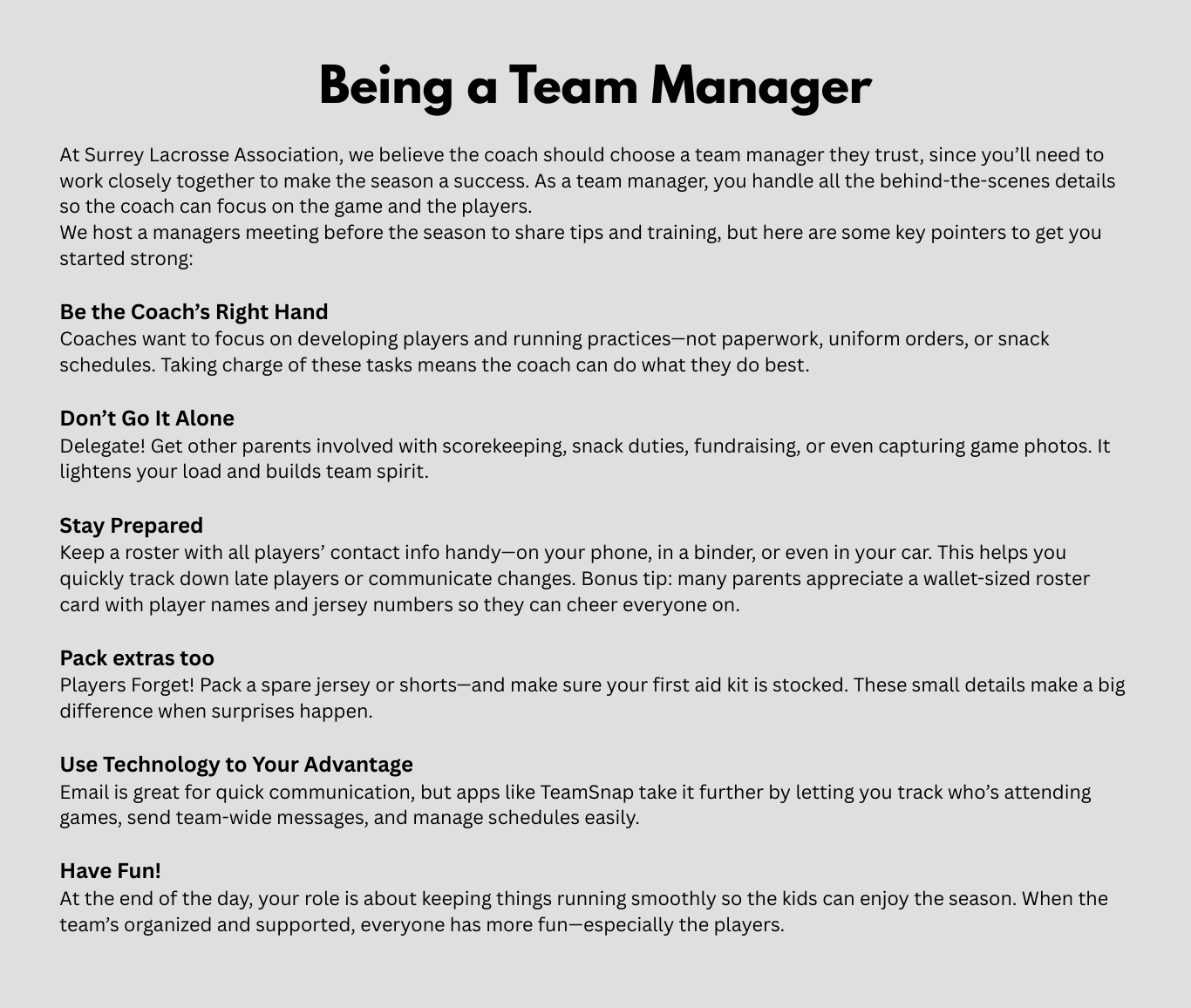 We have a number of online reference documents that may be downloaded to assist managers organize their teams and games.
